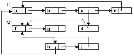 Такое представление несёт с собой одну проблему. На рис. 17 видно, что на узел f имеется три ссылки. В действительности, это ссылки на список N, в котором узел f является начальным. Если потребуется удалить узел f из списка N, то придется регулярным образом обходить всю списочную структуру с целью обнаружения всех ссылок на узел f, что, конечно, неприемлемо.