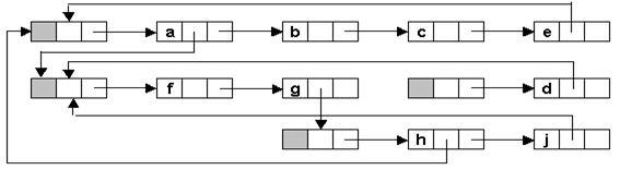 Если потребовать, чтобы каждый список имел голову, то проблема исчезает - на каждый узел, не являющийся головой имеется одна ссылка. Рассмотренная выше структура примет вид как на рис 18.