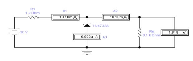 4.1. собрать схему для исследования параметрического стабилизатора напряжения 4.2. Измерить напряжение V2 на выходе схемы и токи во всех ветвях A1, A2, A3 при различных сопротивлениях нагрузки Rn. Результаты измерений занести в таблицу