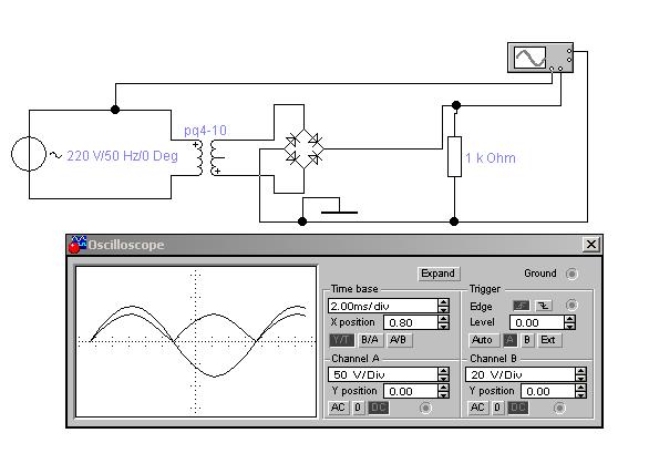 5.2. Собрать схему двухполупериодного выпрямителя.