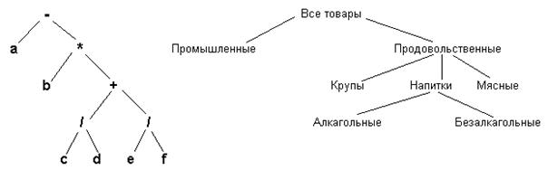 Примерами древовидной структуры являются генеалогические деревья, оглавления, формулы, классификации. На рис. 21 изображены деревья, изображающие формулу a-b*(c/d+e/f)и классификации товаров.