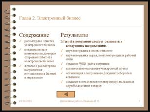 3. Обратите внимание, на слайдах со второго по седьмой имеются элементы управления в виде стрелок. Их следует вставлять в последнюю очередь. При нажатии на кнопку происходит переход к определенному слайду. С организационной диаграммы стрелки уводят на слайды, которые раскрывают содержание определенного раздела дипломной работы. При нажатии на стрелку на слайдах номер 3-7 происходит возврат к слайду номер 2.