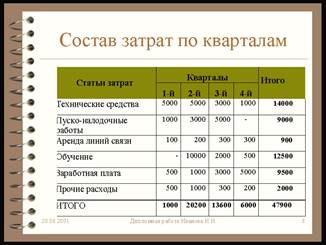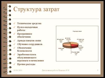 2. Создайте презентацию, показанную на так называемой "выдаче" (распечатке презентации по несколько слайдов на одной странице). Содержание презентации - доклад студента перед государственной комиссией при защите диплома. В состав презентации включены разнообразные виды слайдов, причем первый слайд - титульный. Второй слайд представляет собой организационную диаграмму. С третьего по шестой слайды оформлены маркированными списками в две колонки. Седьмой слайд содержит простой маркированный спиcок. На восьмом слайде в области объектов расположена таблица MS Word. Девятый слайд содержит маркированный список и диаграмму MS Excel. Десятый, последний слайд в заголовке содержит многократно вставленный рисунок, а в области объектов рисунок и объект MS WordArt.