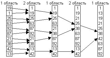 подмножеств, содержащих по два элемента. Затем эти подмножества попарно сливаются, и число их уменьшается вдвое и т.д., пока таблица не будет отсортирована полностью. Рис. 35 поясняет этот процесс. Данные поочередно переписываются из одной области памяти в другую. Все слияния, выполняемые при переходе из одной области в другую, требуют не более N сравнений и необходимо ~log2N таких переходов, следовательно, время сортировки пропорционально N log2N.