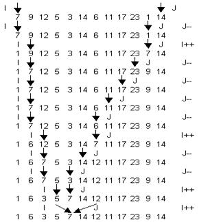 Это, по-видимому, наиболее популярный в мире метод внутренней сортировки. Установим указатели i и j на начало и конец таблицы. После сравнения ключей ti, tj изменяется один из индексов – i или j(увеличивается iили уменьшается j). Первым изменяется j. Если ti > tj, ключи меняются местами, то переключаемся на изменение противоположного указателя. Процесс продолжается до тех пор, пока указатели не "встретятся". Пример выполнения