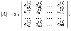 В правой части стоит определитель матрицы порядка . К нему применим тот же алгоритм, и вычисление определителя матрицы сведется к вычислению определителя матрицы порядка . Процесс повторяем до тех пор, пока не дойдем до определителя второго порядка, который вычисляется по определению.
