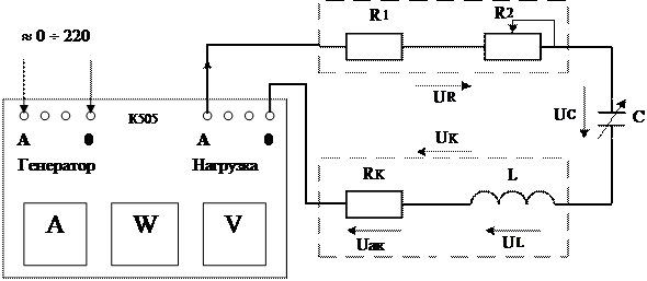 1. Собрать цепь, присоединив исследуемую нагрузку к измерительному комплекту К505. (Схема последовательного соединения элементов цепи представлена на рис. 2.2. Элементы схемы расположены на панели № 3 и № 4 лабораторного стенда.). Измерительный комплект К505 (рис. К.1.) содержит амперметр, ваттметр, вольтметр, соединенные по схеме, представленной на рис. К.2. (С. 29).