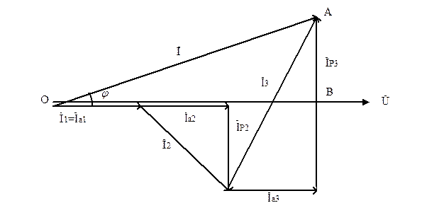 Произвольно выбираем направление вектора напряжения U. Строим вектор тока I1 который совпадает с вектором напряжения U. К концу вектора тока I1 прибавляем вектор тока I2, который, в свою очередь, имеет активную Iа2 и реактивную Iр2 (индуктивную) составляющие. Активная составляющая вектора тока Iа2 совпадает с вектором напряжения U, реактивная Iр2 - отстает от вектора напряжения U на угол 90°. К концу вектора тока I2 прибавляем вектор тока I3, который также имеет две составляющие: активная составляющая вектора тока Iа3 совпадает по фазе с вектором напряжения U, реактивная (емкостная) составляющая вектора тока Iр3 - опережает вектор напряжения U на угол 90°. Вектор тока I в неразветвленной части цепи получим, соединив начало первого вектора тока I1 с концом последнего вектора тока I3.