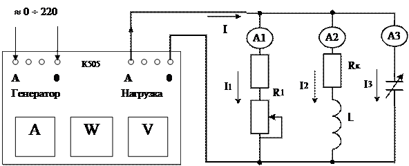 1. Собрать цепь, присоединив исследуемую нагрузку к измерительному комплекту К505. (Схема параллельного соединения элементов нагрузки представлена на рис. 4.4. Элементы схемы расположены на панели № 3 и № 4 лабораторного стенда.) Измерительный комплект К505 (рис. К.1.) содержит амперметр, ваттметр, вольтметр, соединенные по схеме, представленной на рис. К.2. (С. 29).