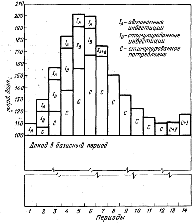 *** Числа этой колонки равны для каждого периода удвоенной разности между объемами стимулированного потребления данного периода и предшествующего периода. Так, например, стимулированные инвестиции периода 3 вдвое превышают число 13,30 (стимулированное потребление периода 3 минус стимулированное потребление периода 2). Эта особенность вытекает из допущения, что каждый случай увеличения потребления вызывает (посредством действия акселератора) увеличение инвестиций, равное удвоенному объему увеличения потребления.