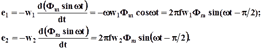 При подключении первичной обмотки трансформатора к сети синусоидального напряжения, магнитного потока , также будет изменяться от времени по синусоидальному закону, т. е. . Тогда ЭДС, согласно закону электромагнитной индукции, будут соответственно равны
