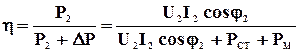 Коэффициент полезного действия (КПД) трансформатора определяют как отношение активной мощности на нагрузке к активной мощности, потребляемой из сети: