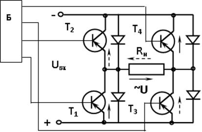 На рисунке 4.1 представлен однофазный двухтактный инвертор, где в качестве коммутирующих ключей использованы транзисторы Т1– Т4, управляемые от блока управления БУ.