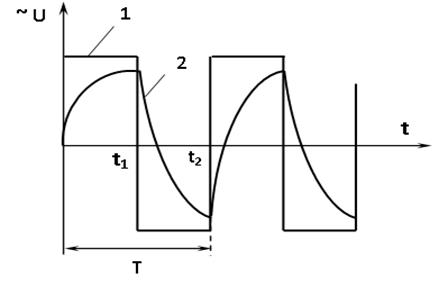 Кривая выходного напряжения однофазного полумостового инвертора показана на рисунок 4.4. Если конденсаторы С1и С2 имели бы бесконечную большую емкость , то кривая выходного напряжения имела бы прямоугольную форму. Из-за снижения напряжения на конденсаторе при его разряде форма кривой выходного напряжения отличается от прямоугольной.
