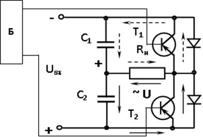 Принцип действия такого однофазного полумостового инвертора с конденсаторами заключается в следующем. В исходном состоянии транзисторы Т1и Т2 закрыты при этом конденсаторы С1и С2будутзаряжены до некоторого значения напряжения. Если теперь транзистор Т1открыт, а Т2 закрыт (открытые и закрывание транзисторов обеспечивается БУ), то конденсатор С1разрежается через нагрузку Rн , т. е. ток потечет ток через транзистор Т1и резистор Rн. Через времени t = t1 = Т/2(Т – период выходного напряжения), которая определяет частоту переменного напряжения, закрывается транзисторТ1 и открывается Т2.При этомконденсатор С2 будет разрежаться через нагрузку Rн и ток через Rн потечет в обратном направлении. В это же время разраженный конденсатор С1будет заряжаться от источника постоянного тока. Через времени t = t2 = Т/2закрывается транзисторТ2 и открываетсяТ1цикл продолжится.