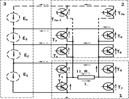 Многоступенчатый транзисторный инвертор работает следующим образом. Мостовая схема инвертора 1, образованного транзисторами T1, T2, T3 и T4 (рисунок 4.6) подключена к первому источнику напряжения Е1. В момент времени t1 (рисунок 4.7) открывается транзисторы T1 и T4 и постоянный ток от источника напряжения Е1 будет протекать через транзисторы T1, нагрузку Rн и T4 (направление постоянного тока через транзисторы и нагрузку показаны сплошными стрелками). Через некоторое время t2 открывается транзистор T6 и постоянный ток от второго источника постоянного напряжения Е2 будет протекать через транзисторы T1, нагрузку Rн и T6, образуя вторую ступень напряжения на нагрузке. Для формирования ступенчатого напряжения на нагрузке в момент времени t3 (рисунок 4.4) открывается транзистор T8 и постоянный ток от источника Е3 будет протекать через транзисторы T1, нагрузку Rн и T8 . Для подключения Еn источника постоянного напряжения в момент времени tn открывается транзистор T 2n и постоянный ток будет протекать через транзисторы T1, нагрузку Rн и транзистор T 2n .