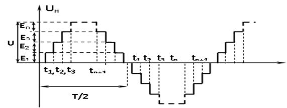 Для формирования отрицательного периода многоступенчатого напряжения на нагрузке в момент времени t1 + T/2(рисунке 4.6), T – периода многоступенчатого напряжения, открываются транзисторы T2 и T3 и постоянный ток от Е1 будет протекать через транзистор T2, через нагрузку Rн в обратном направлении и T3 (на рисунке 4.5 постоянный тока обратного направления показан пунктирной стрелкой). Через время t2 + T/2открывается транзистор T5 и постоянный ток от второго источника Е2 будет протекать через транзисторы T2, нагрузку Rн и T5. В момент времени t3 + T/2 открывается транзистор T7 и постоянный ток от Е3 будет протекать через транзисторы T2, T7 и нагрузку Rн. Источник постоянного напряжения Еn будет подключен в момент времени tn + T/2 транзистором T 2n и постоянный ток будет протекать через транзисторы T1, T 2n и нагрузку Rн .