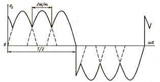Преобразователь с непосредственной связью представляет собой управляемый выпрямитель, имеющий два комплекта тиристоров. Выходное напряжение формируется за счет последовательной коммутации тиристоров, присоединенных к различным фазам первичной сети. Положительная полуволна формируется за счет тиристоров группы К(катодная группа), а отрицательная – за счет тиристоров группы А(анодная группа). Форма вторичного напряжения представлена на рисунке 9. 2.