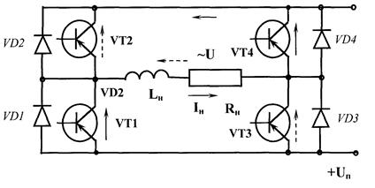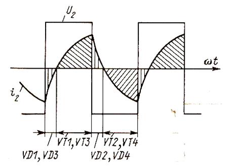По команде от задающего устройства транзисторные ключи VT1, VT4 и VT2, VT3 попарно поочередно включаются. При этом на выходе преобразователя получаем напряжение прямоугольной формы. При индуктивной нагрузке форма кривой тока имеет вид, представленный на рисунке 9.7. Для пропуска запасенной электромагнитной энергии после отключения соответствующего тиристора в схеме используются диоды VD1-VD4. Кривые токов, протекающих через них, показаны на том же рисунке 9.7.