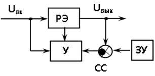 Компенсационные стабилизаторы напряжения с непрерывным регулированием представляют собой систему автоматического регулирования, в которой с заданной степенью точности поддерживается выходное напряжение Uвых. Стабилизатор содержит регулирующий элемент РЭ, схему сравнения СС и усилитель У в цепи обратной связи (рисунок 11. 9).