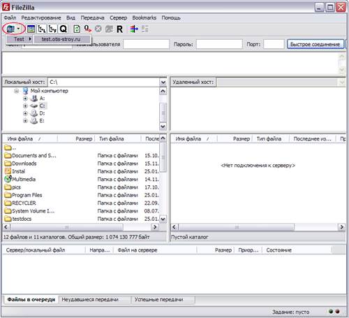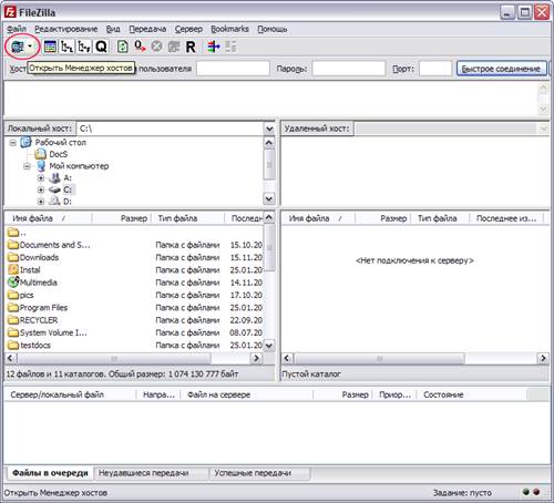 В окне программы нет ничего лишнего, что бы отвлекало внимание от основной задачи – загрузки и скачивания данных с FTP-сервера. Чтобы подключиться к FTP-серверу нужно ввести его адрес, логин и пароль доступа. Для этого служит кнопочка «Открыть Менеджер хостов», расположенная у левого края панели инструментов FileZilla.