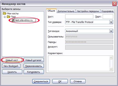 Для добавления FTP-сервера в список нажмите кнопку «Новый хост» и ведите понятное вам название хоста. Можно перед этим добавить новую папку, используя кнопку «Новый каталог», чтобы заранее систематизировать FTP-сервера.
