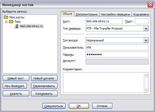 Теперь нужно ввести данные для доступа к FTP-серверу: его адрес, логин и пароль пользователя. Для этого выделите нужный хост в списке и на вкладке «Общие» в поле «Хост» введите адрес FTP-сервера. В списке «Тип сервера» выберите «FTP – File Transfer Protocol». Тип входа будет зависеть от настроек на FTP-сервере. В ряде случаев доступ к нему осуществляется по логину и паролю, который вам может сообщить, например, администратор сервера. Поэтому в списке «Тип входа» выберите «Нормальный» и введите логин и пароль FTP-пользователя. Для сохранения введенной информации нажмите кнопку «ОК».