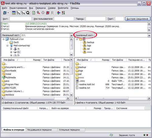 В левой части окна программы в области «Локальный хост» отображается ваш компьютер: дерево каталогов и содержимое выделенного диска или папки. В правой части окна FileZilla в области «Удаленный хост» появится дерево каталогов FTP-сервера, а под ним содержимое выделенного в этом дереве каталога.