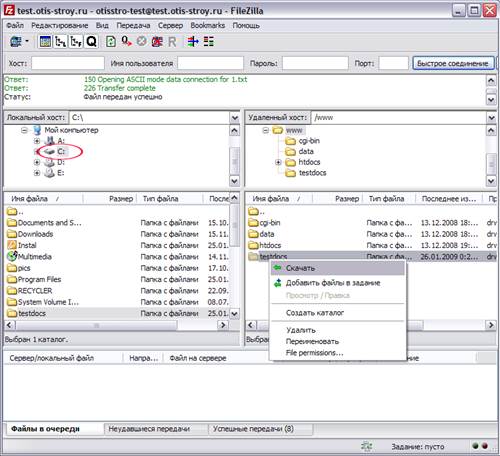 Чтобы перемещать файлы и папки между вашим компьютером и FTP-сервером просто перейдите в нужный каталог и перетащите их мышкой. Этот метод называется drag-and-drop, что в переводе означает «тащи и бросай». В FileZilla есть и другой способ скачивания файлов и папок к себе на компьютер: выделите папку или файл на FTP-сервере, нажмите правую кнопку мыши и выберите «Скачать». Папка (файл) сохранится в тот каталог, который выделен в дереве каталогов Локального хоста. У нас это диск С.