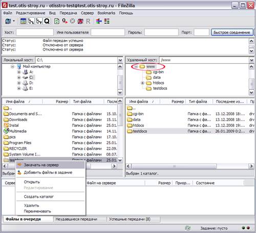 А чтобы закачать файл (папку) со своего компьютера на FTP-сервер щелкните по нему правой кнопкой мыши и выберите «Закачать на сервер». Файл будет сохранен в папку, выделенную в дереве каталогов Удаленного хоста.