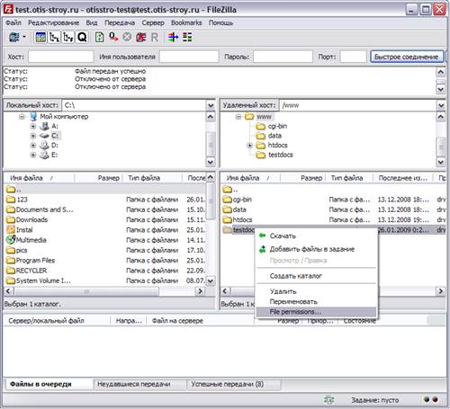 В FileZilla также можно задавать и изменять права доступа к папкам и файлам на FTP-сервере. Для этого достаточно щелкнуть по нужной папке (файлу) правой кнопкой мыши и выбрать «File permissions…», а в открывшемся окошке установить нужные права и нажать «ОК».