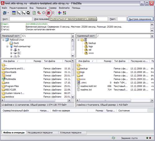Для отключения от FTP-сервера нажмите кнопку «Отключиться от просматриваемого сервера» на панели инструментов FileZilla.
