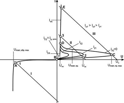 Участок AB соответствует обратной характеристике, когда к аноду тиристора приложено отрицательное напряжение относительно катода. При разомкнутой цепи управления или отсутствии в ней тока (Iу=0) обратная характеристика тиристора аналогична обратной ВАХ полупроводникового диода. В рабочем диапазоне напряжений UЗС от 0 до максимального рабочего, называемого обратным повторяющимся напряжением Uповт, обр max, через прибор протекает очень малый, порядка долей миллиампера, ток (рабочая точка 1).
