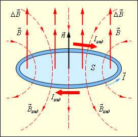Опыт показывает, что индукционный ток, возбуждаемый в замкнутом контуре при изменении магнитного потока, всегда направлен так, что создаваемое им магнитное поле препятствует изменению магнитного потока, вызывающего индукционный ток. Это утверждение называетсяправилом Ленца (1833 г.). Рис. 4.20.2 иллюстрирует правило Ленца на примере неподвижного проводящего контура, который находится в однородном магнитном поле, модуль индукции которого увеличивается во времени.