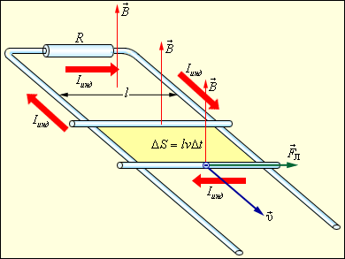Правило Ленца отражает тот экспериментальный факт, что инд и всегда имеют противоположные знаки (знак «минус» в формуле Фарадея). Правило Ленца имеет глубокий физический смысл – оно выражает закон сохранения энергии. Изменение магнитного потока, пронизывающего замкнутый контур, может происходить по двум причинам. 1. Магнитный поток изменяется вследствие перемещения контура или его частей в постоянном во времени магнитном поле. Это случай, когда проводники, а вместе с ними и свободные носители заряда, движутся в магнитном поле. Возникновение ЭДС индукции объясняется действием силы Лоренца на свободные заряды в движущихся проводниках. Сила Лоренца играет в этом случае роль сторонней силы. Рассмотрим в качестве примера возникновение ЭДС индукции в прямоугольном контуре, помещенном в однородное магнитное поле перпендикулярное плоскости контура. Пусть одна из сторон контура длиной l скользит со скоростью по двум другим сторонам (рис. 4.20.3).