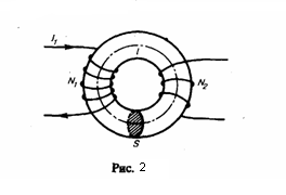 Найдем взаимную индуктивность двух катушек, которые намотаны на общий тороидальный сердечник. Этот случай имеет большое практическое значение (рис. 2). Магнитная индукция поля, которое создавается первой катушкой с числом витков N1, током I1 и магнитной проницаемостью μ сердечника, B = μμ0(N1I1/l) где l — длина сердечника по средней линии. Магнитный поток сквозь один виток второй катушки Ф2 = BS = μμ0(N1I1/l)S