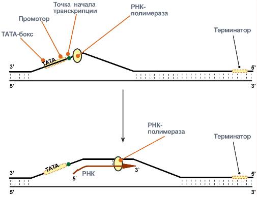 Промотор содержит стартовый сигнал транскрипции – ТАТА-бокс. Так называется определенная последовательность нуклеотидов ДНК, связывающая первый фактор инициации ТАТА-фактор. Этот ТАТА-фактор обеспечивает присоединение РНК-полимеразы к той нити ДНК, которая будет использоваться в качестве шаблона для транскрипции (матричная нить ДНК). Так как промотор ассиметричен ("ТАТА"), то он связывает РНК-полимеразу только в одной ориентации, что определяет направление транскрипции от 5'-конца к 3'-концу (5'→3'). Для связывания РНК-полимеразы с промотором необходим еще один фактор инициации – σ-фактор (греч. σ – "сигма"), но сразу после синтеза затравочного фрагмента РНК (длиной 8-10 рибонуклеотидов) σ-фактор отрывается от фермента.