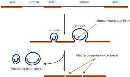 При транскрипции участков ДНК, несущих информацию о белках, образуются гетерогенные ядерные РНК, по размеру намного превосходящие мРНК. Дело в том, что из-за мозаичной структуры генов эти гетерогенные РНК включают в себя информативные (экзоны) и неинформативные (интроны) участки.