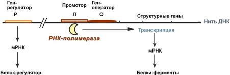 Регуляция биосинтеза белка у прокариот осуществляется на уровне изменения скорости синтеза мРНК. В настоящее время принята теория оперона, сформулированная Франсуа Жакобом и Жаком Моно. В основе теории лежат следующие понятия: