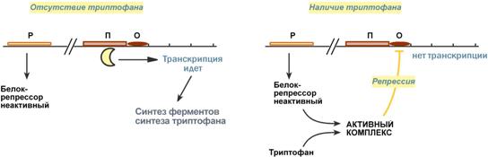Функционирование триптофанового оперона в некотором смысле противоположно лактозному. Регуляция осуществляется по механизму репрессии.