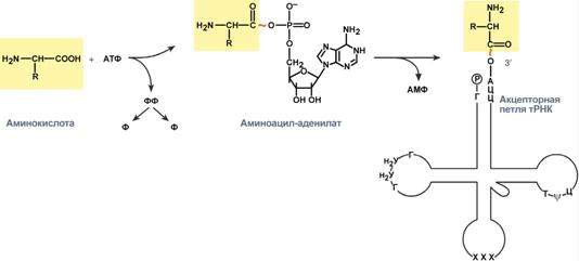 Присоединение аминокислоты к тРНК осуществляется ферментом аминоацил-тРНК-синтетазой, имеющей специфичность одновременно к двум соединениям: какой-либо аминокислоте и соответствующей ей тРНК. Для реакции требуется две макроэргические связи АТФ. Аминокислота присоединяется к 3'-концу акцепторной петли тРНК через свою α-карбоксильную группу, и связь между аминокислотой и тРНК становитсямакроэргической. α-Аминогруппа остается свободной.