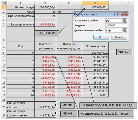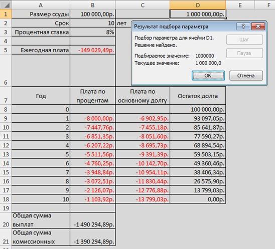 Общую сумму комиссионных вычисляем как разницу между общей суммой выплат и размером ссуды (рис.10 и рис.11).
