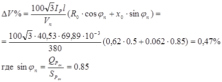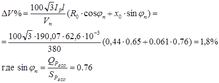 6. Проверка правильности выбора сечения кабеля по условию допустимой величины потери напряжения; принимаем эту величину равной 5%: