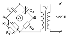Установка смонтирована в металлическом корпусе. Схема ее представлена на рис.3.6: Сх– конденсатор с неизвестной емкостью;Сэ– эталонная емкость (магазин емкостей ); R1и R2– известные сопротивления:R2=10 кОм; R1 можно менять, устанавливая 12 кОм или 2 кОм.