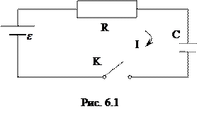 Рассмотрим процесс заряда конденсатора в электрической цепи, содержащей последовательно соединенные конденсатор С, сопротивление R и источник ЭДС ε (рис. 6.1). Первоначально конденсатор не заряжен. Пусть I, q, U – мгновенные значения тока, заряда и разности потенциалов между обкладками конденсатора. Полагаем, что токи и напряжения удовлетворяют условиям квазистационарности, т.е. мгновенное значение тока во всех сечениях провода и элементах цепи (рис. 6.1) одно и то же, и соотношение между мгновенными значениями I, q и U такое же, как и в цепи постоянного тока. В момент времени t=0 ключ К замкнули, и в цепи пошел ток, заряжающий конденсатор , где q – заряд конденсатора. Применим закон Ома к цепи (рис. 6.1):