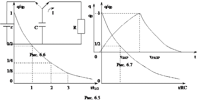где . Произведение RС имеет размерность времени ( ) и называется постоянной времени, или временем релаксации . За время заряд конденсатора уменьшается в e раз. Для определения RС часто удобно измерять время, за которое величина заряда падает до половины первоначального значения, так называемое "половинное время" t1/2. "Половинное время" определяется из выражения