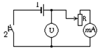 Установка смонтирована в металлическом корпусе. Схема ее представлена на рис. 8.1: 1 – источник тока; 2 – тумблер включения; U – вольтметр; mA – миллиамперметр; R – реостат. Метод определения ЭДС состоит в измерении тока и напряжения в цепи при различных значениях сопротивления нагрузки. Если R1 и R2 – сопротивления нагрузки, то этим сопротивлениям, как следует из формулы (8.4), соответствуют токи: