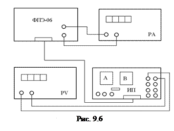 Амперметр на панели источника питания служит для контроля тока накала IН, максимальное значение которого не должно превышать 2.2 А. Плавная регулировка напряжения накала осуществляется ручкой, расположенной под амперметром. Напряжение накала UН измеряется вольтметром (PV), который подключается к тем клеммам на источнике питания, где указано напряжение 2,5–4,5 В. Вольтметр на панели источника питания измеряет анодное напряжение UА, регулировка которого осуществляется ручкой на панели источника питания, расположенной непосредственно под вольтметром. Для измерения анодного тока IН используется амперметр, который подключается к модулю ФПЭ-06 к клеммам РА. Он должен работать в режиме миллиамперметра, измеряя ток до 20 mA.