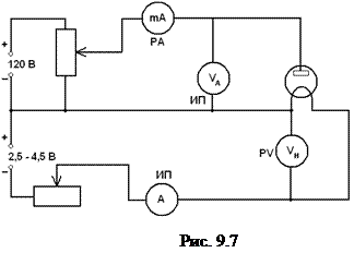 Электрическая схема для проведения опыта представлена на (рис. 9.6 и 9.7). В качестве диода в работе используется радиолампа с вольфрамовым катодом прямого накала. Нагрев катода осуществляется постоянным током. Амперметр и вольтметр в цепи накала служат для определения мощности, расходуемой на нагрев катода, что необходимо для определения температуры.
