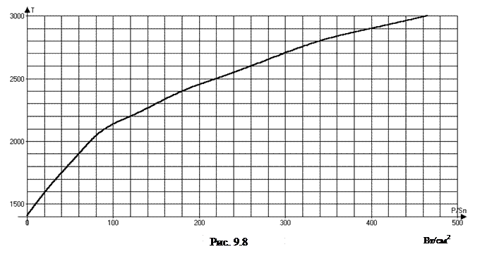 6. По графику (рис. 9.8) зависимости температуры катода от расходуемой на его нагрев мощности определить температуру катода для каждого значения мощности нагрева.